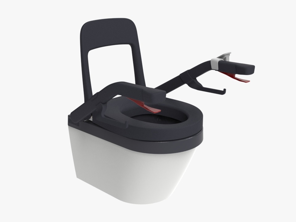 The toilet seat can easily be rotated using a trigger mechanism integrated in the support handles. The bars can be lowered and raised independently of each other. The back rest and toilet seat cover can easily be removed for cleaning.